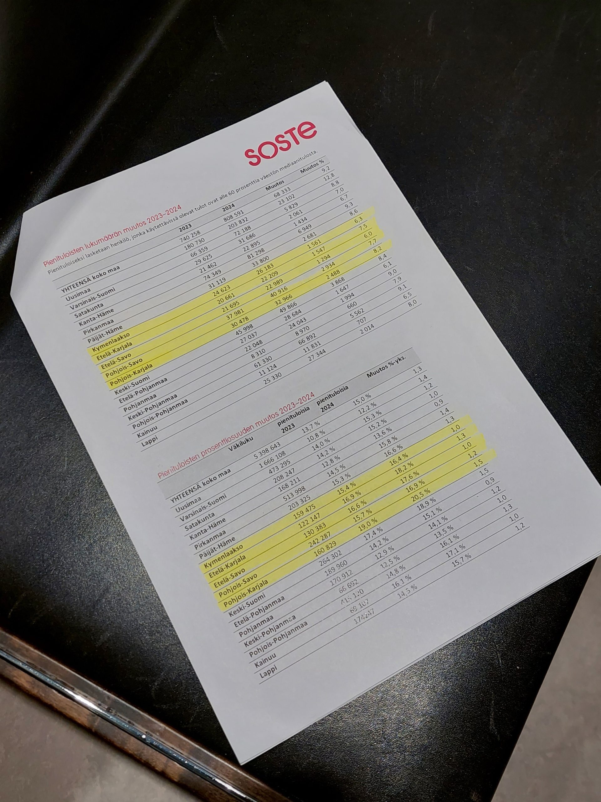 Nämä laskelmat osoittavat, että hallituksen esittämät indeksijäädytykset sekä työttömyysturvaan ja asumistukeen kohdistuvat leikkaukset lisäävät köyhyyttä koko maassa. Köyhien määrä kasvaa koko väestötasolla 9,2 prosenttia, tämä koskettaa 68 000:tta aikuista ja 16 700:aa lasta. Tämä on peräti 13,6 prosenttia kaikista alle 18 vuotiaista. SOSTE selvitti köyhyyden muutokset myös maakunnittain ja suurimmat nousut pienituloisten määrässä osuvat Pohjois-Karjalaan ja Keski-Suomeen. Esimerkiksi Pohjois-Karjalassa pienituloisten määrä nousisi lähes 2500:lla henkilöllä tästä vuodesta ensi vuoteen.