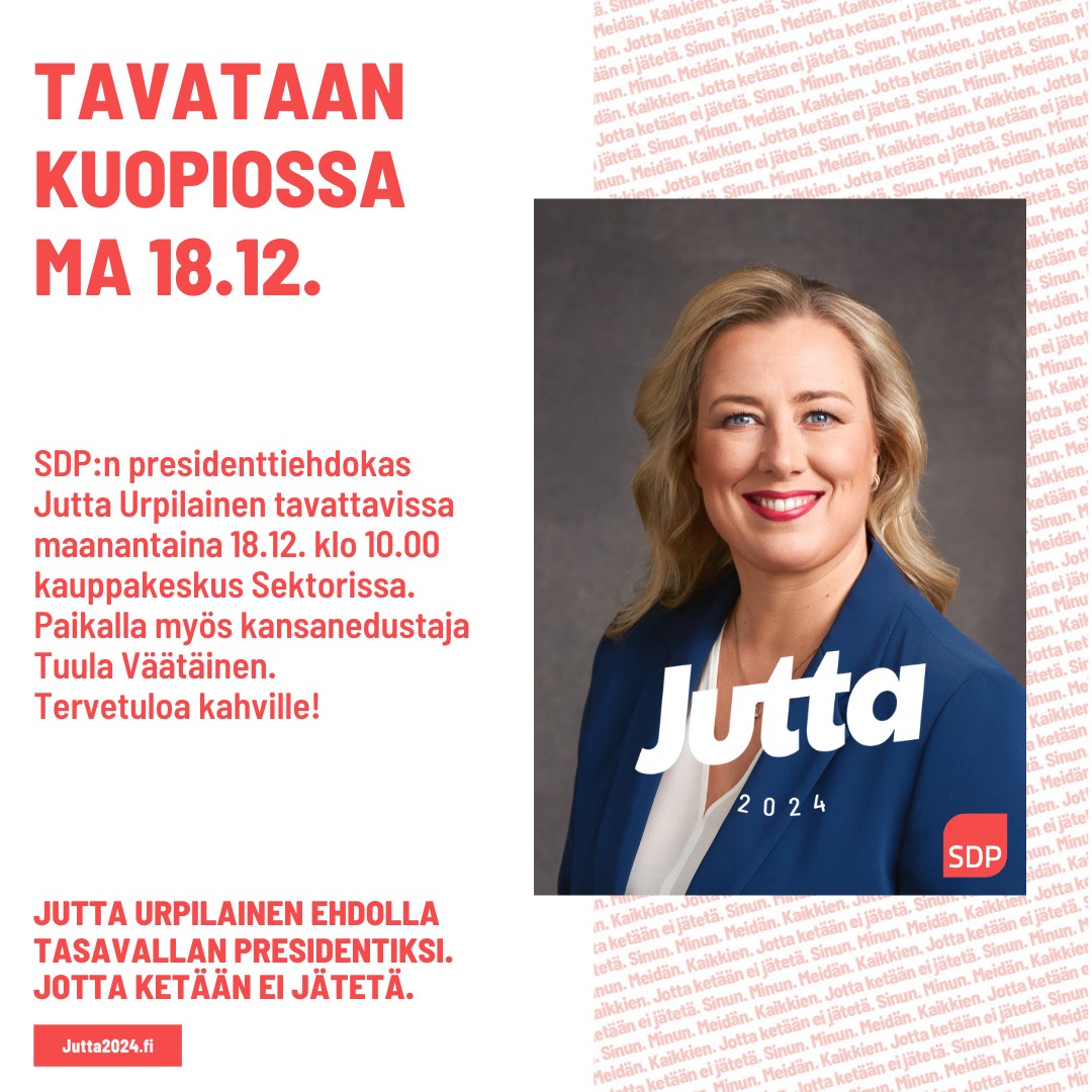 Jutta tulee Kuopioon ensi maanantaina 18.12. tapaamaan meitä, tulethan sinäkin kello 10.00 kauppakeskus Sektorin ala-aulaan.
